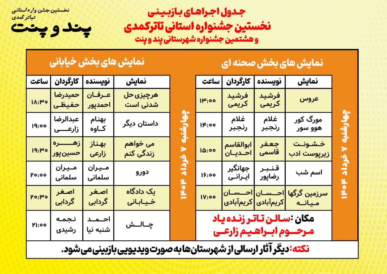 دبیرخانه جشنواره تئاتر پند و پنت و مصطفی کریمی، دبیر جشنواره، در تاریخ چهارشنبه ۷ خردادماه ۱۴۰۴ اعلام کردند که بازبینی آثار بخش صحنهای و خیابانی این رویداد فرهنگی آغاز شده است.